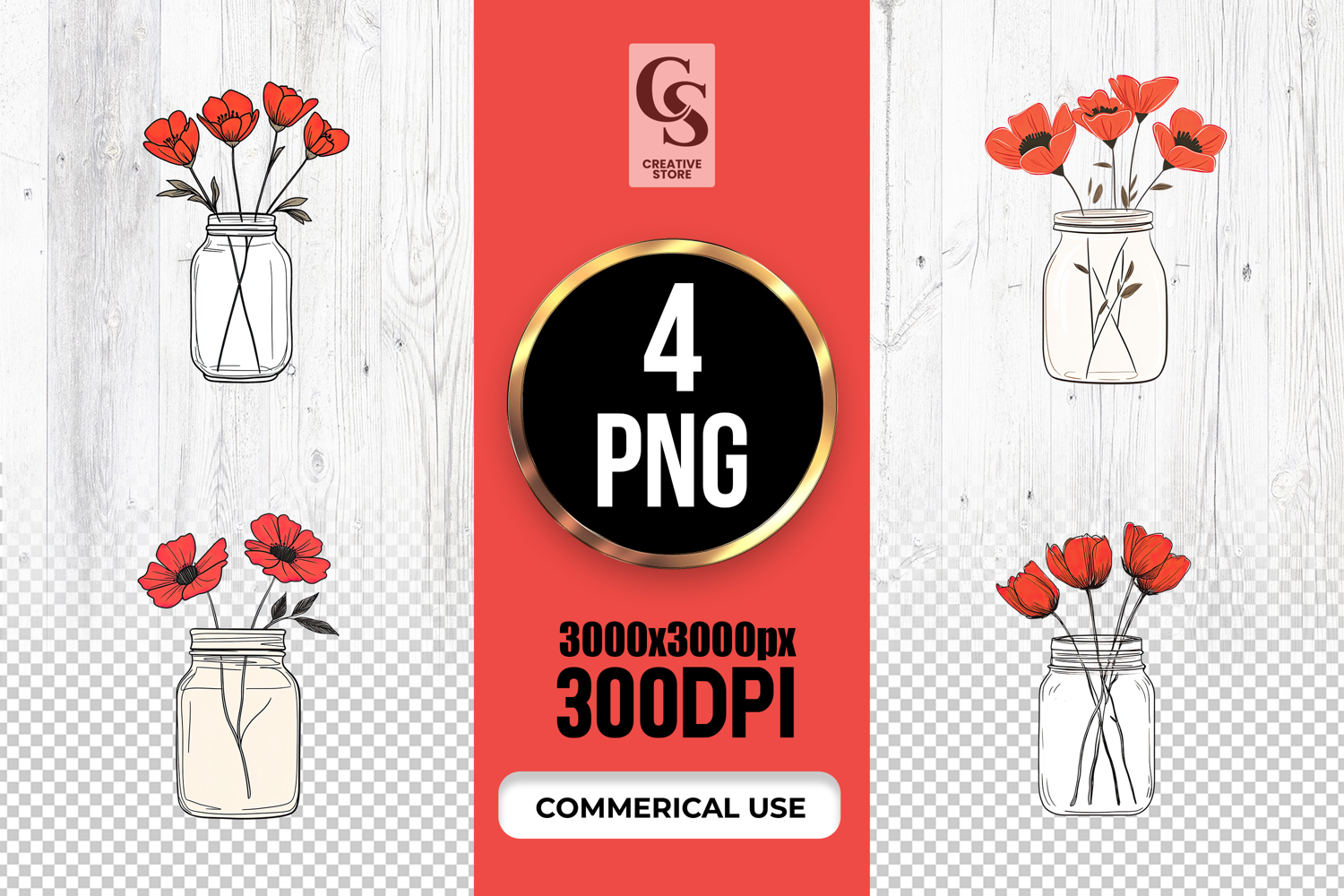 4 Red Poppy Bouquet in Mason Jar Clipart Sublimation PNG Files Perfect for Greeting Cards, Invitations, Junk Journal, Party Decor, Scrapbooking and many other craft projects.