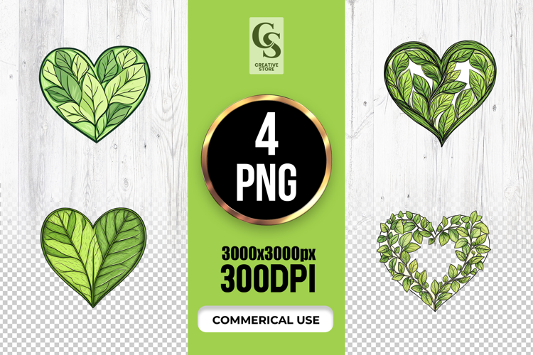 4 Green Leaf Heart Clipart — Botanical Sublimation PNG Files Perfect for Greeting Cards, Invitations, Junk Journal, Party Decor, Scrapbooking and many other craft projects.