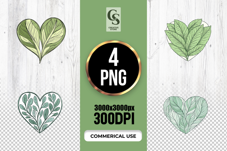 4 Green Leaf Heart Botanical Clipart — Sublimation PNG Files Perfect for Greeting Cards, Invitations, Junk Journal, Party Decor, Scrapbooking and many other craft projects.