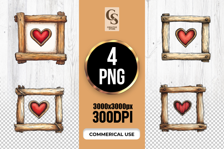 4 Rustic Wooden Frame Heart Illustration Clipart png Files Perfect for Greeting Cards, Invitations, Junk Journal, Party Decor, Scrapbooking and many other craft projects.