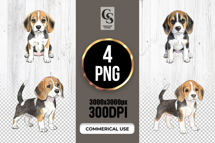 4 Cute Beagle Puppy Watercolor Clipart Sublimation PNG Files Perfect for Greeting Cards, Invitations, Junk Journal, Party Decor, Scrapbooking and many other craft projects.