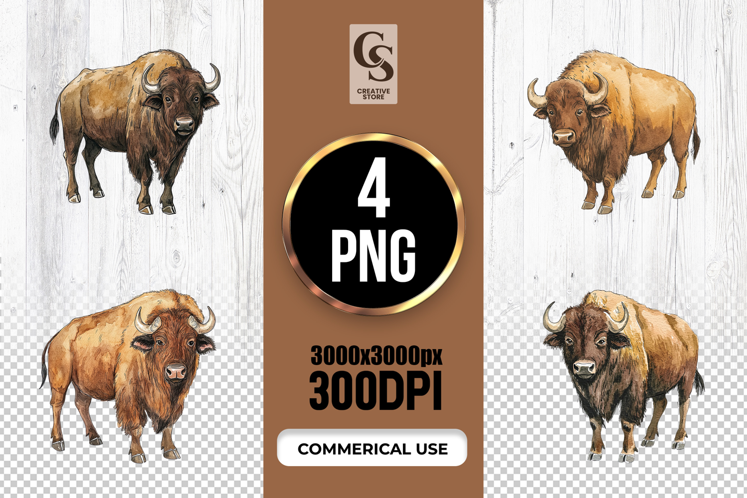 4 American Bison Watercolor Clipart Sublimation PNG Files Perfect for Greeting Cards, Invitations, Junk Journal, Party Decor, Scrapbooking and many other craft projects.