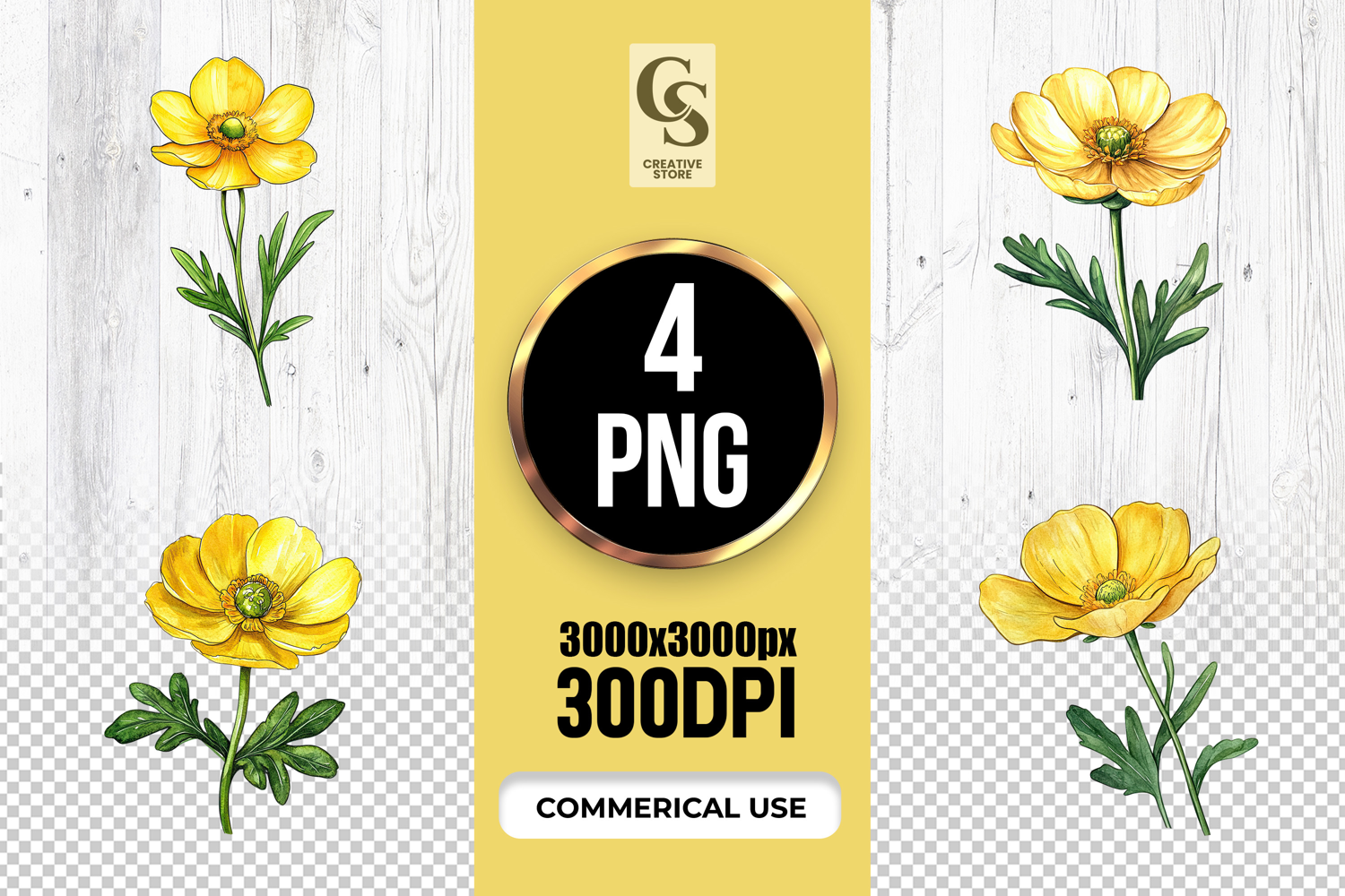 4 Yellow Buttercup Flower Watercolor Clipart Sublimation PNG Files Perfect for Greeting Cards, Invitations, Junk Journal, Party Decor, Scrapbooking and many other craft projects.