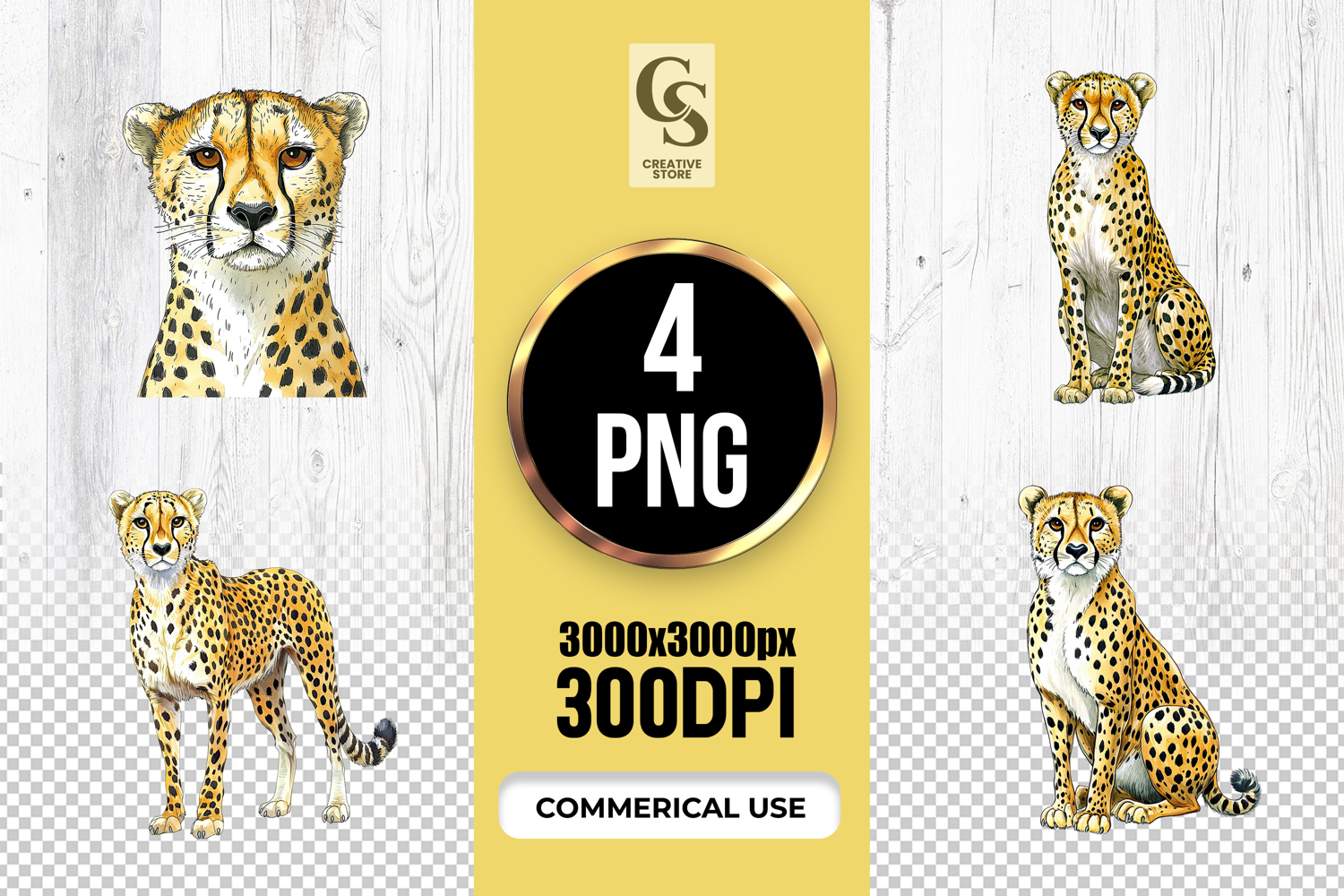 4 Cheetah Watercolor Clipart Sublimation PNG Files Perfect for Greeting Cards, Invitations, Junk Journal, Party Decor, Scrapbooking and many other craft projects.