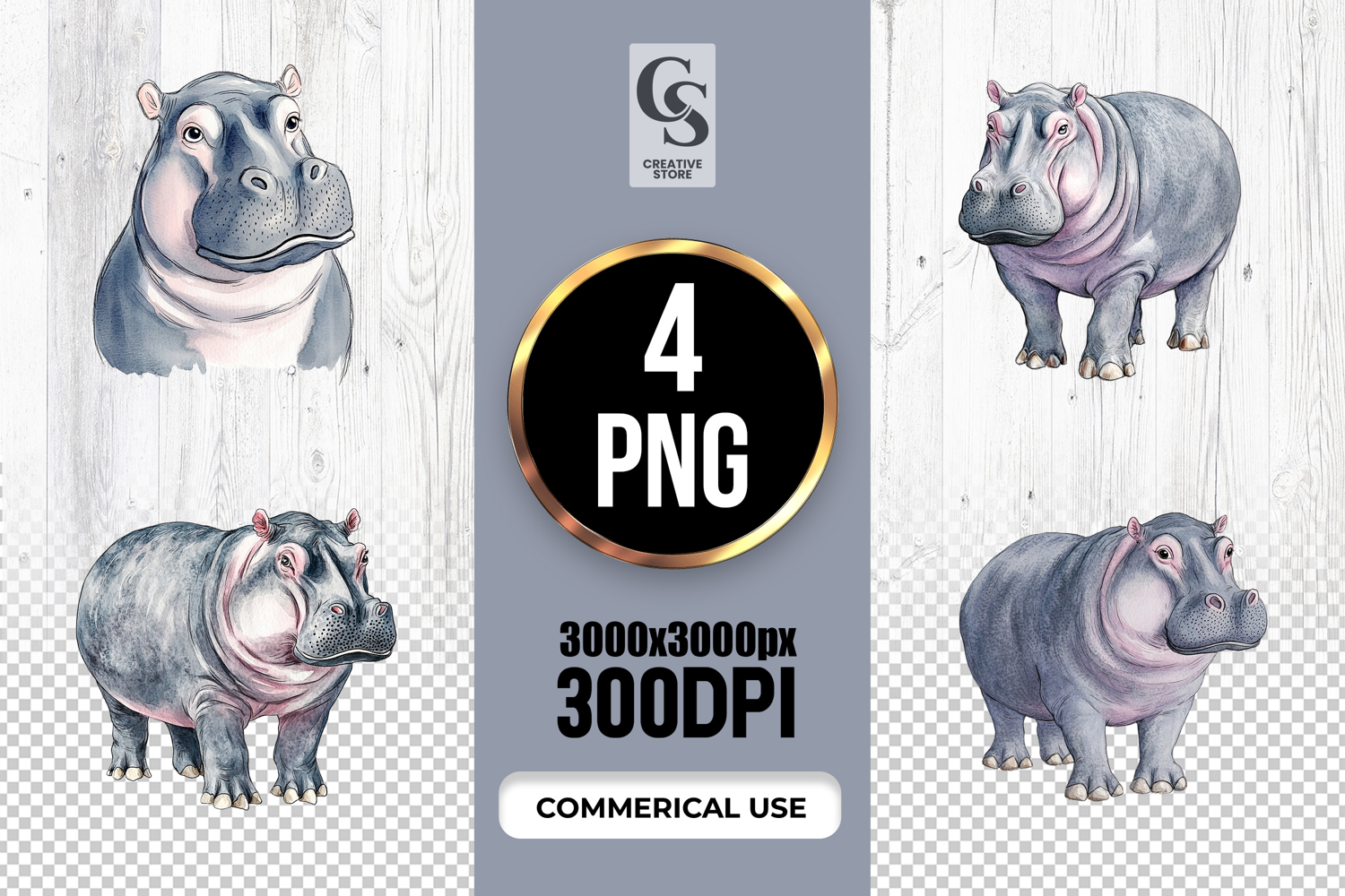 4 Watercolor Hippo Animal Illustration Clipart Sublimation PNG Files Perfect for Greeting Cards, Invitations, Junk Journal, Party Decor, Scrapbooking and many other craft projects.