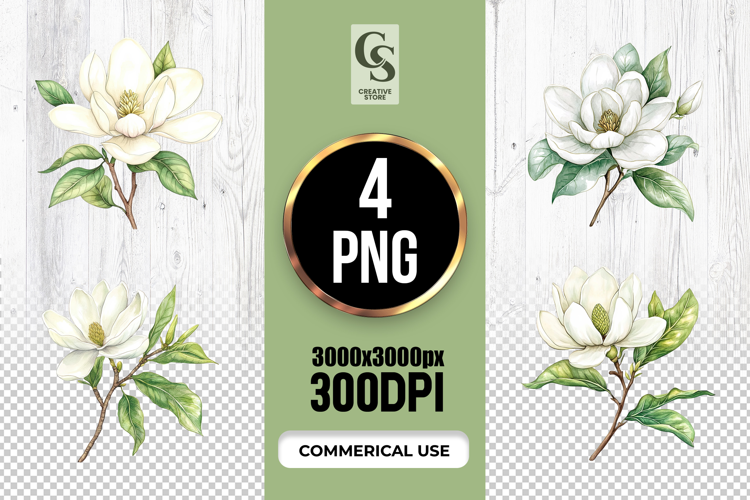 4 Watercolor Magnolia Flower Clipart Sublimation PNG Files Perfect for Greeting Cards, Invitations, Junk Journal, Party Decor, Scrapbooking and many other craft projects.