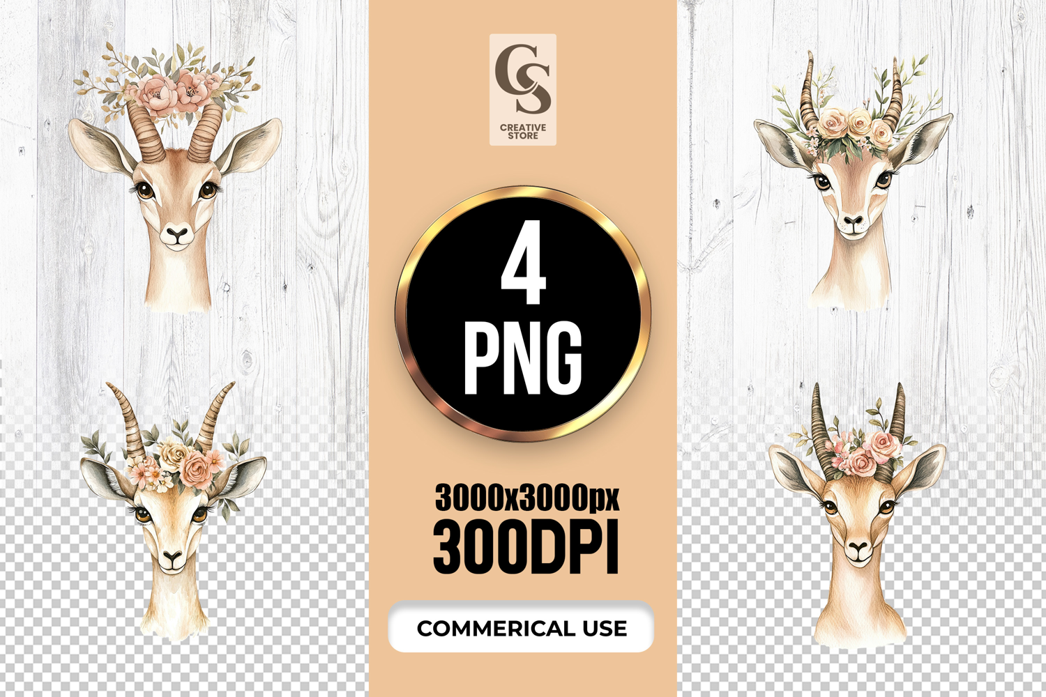 4 Floral Gazelle Watercolor Clipart Sublimation PNG Files Perfect for Greeting Cards, Invitations, Junk Journal, Party Decor, Scrapbooking and many other craft projects.