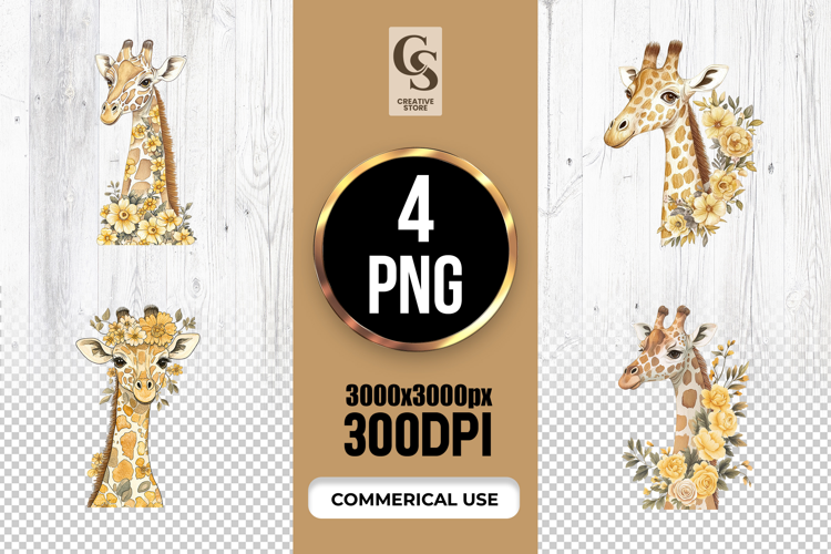 4 Watercolor Floral Giraffe Clipart Sublimation PNG Files Perfect for Greeting Cards, Invitations, Junk Journal, Party Decor, Scrapbooking and many other craft projects.