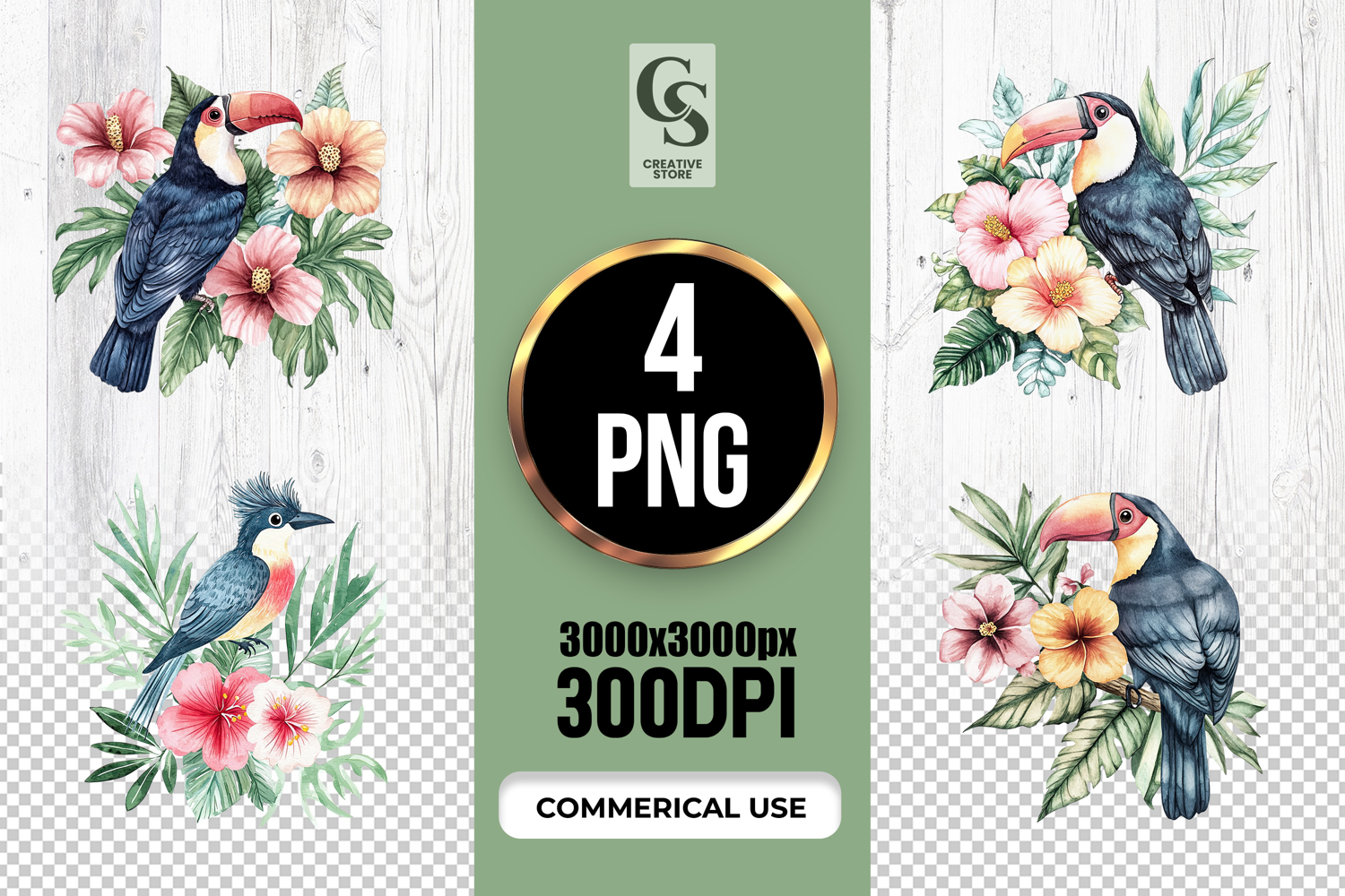 4 Watercolor Tropical Toucan Clipart Sublimation PNG Files Perfect for Greeting Cards, Invitations, Junk Journal, Party Decor, Scrapbooking and many other craft projects.