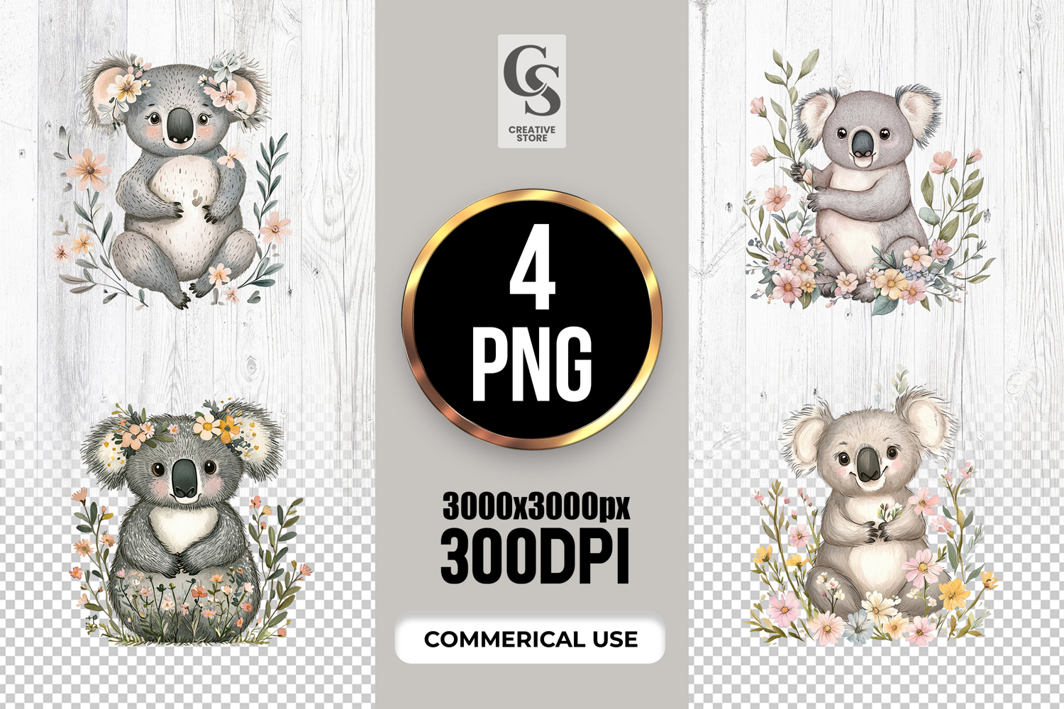 4 Cute Watercolor Koala Floral Clipart Sublimation PNG Files Perfect for Greeting Cards, Invitations, Junk Journal, Party Decor, Scrapbooking and many other craft projects.