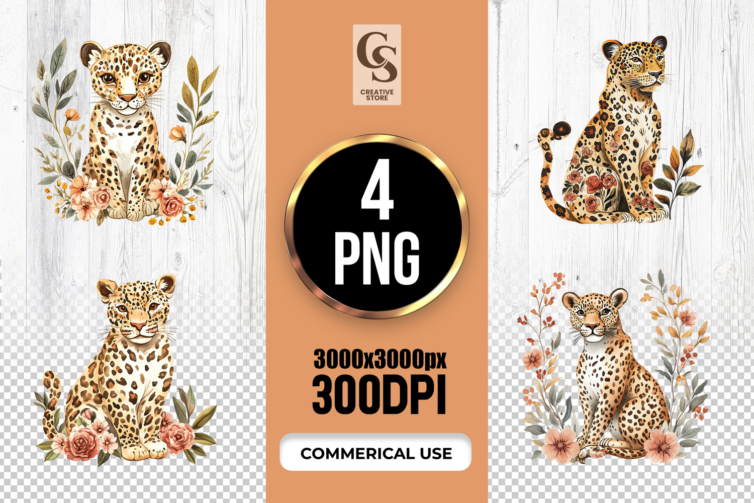 4 Watercolor Floral Leopard Clipart Sublimation PNG Files Perfect for Greeting Cards, Invitations, Junk Journal, Party Decor, Scrapbooking and many other craft projects.