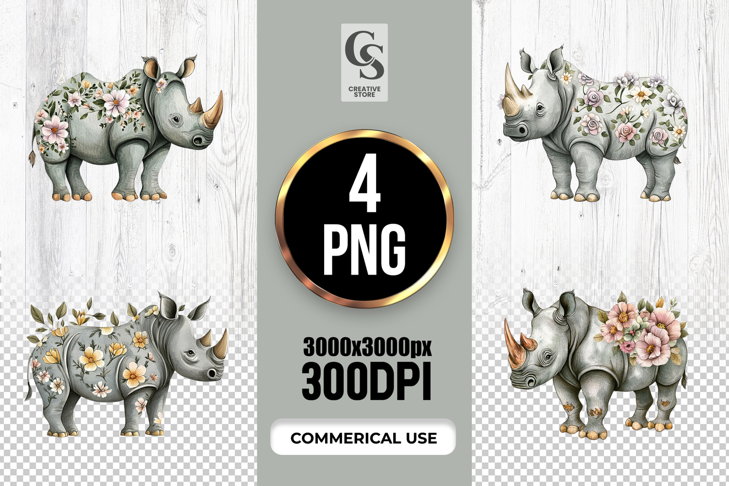 4 Floral Rhino Watercolor Illustration Clipart Sublimation PNG Files Perfect for Greeting Cards, Invitations, Junk Journal, Party Decor, Scrapbooking and many other craft projects.