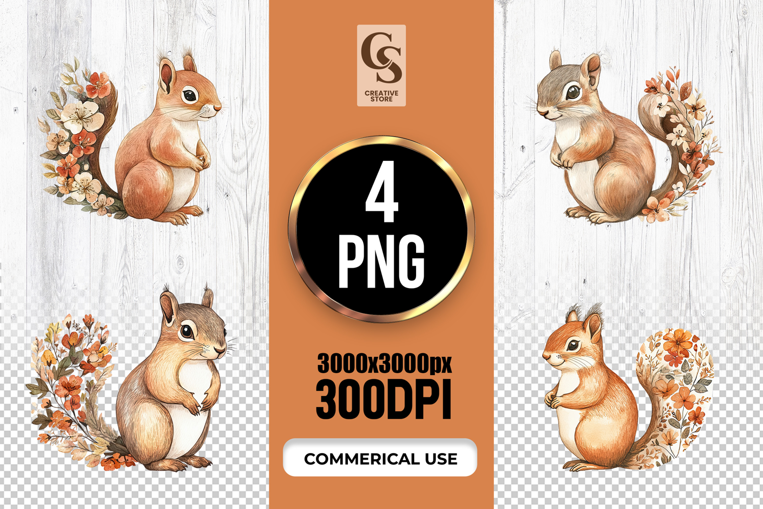 4 Floral Squirrel Watercolor Illustration Clipart PNG Files Perfect for Greeting Cards, Invitations, Junk Journal, Party Decor, Scrapbooking and many other craft projects.
