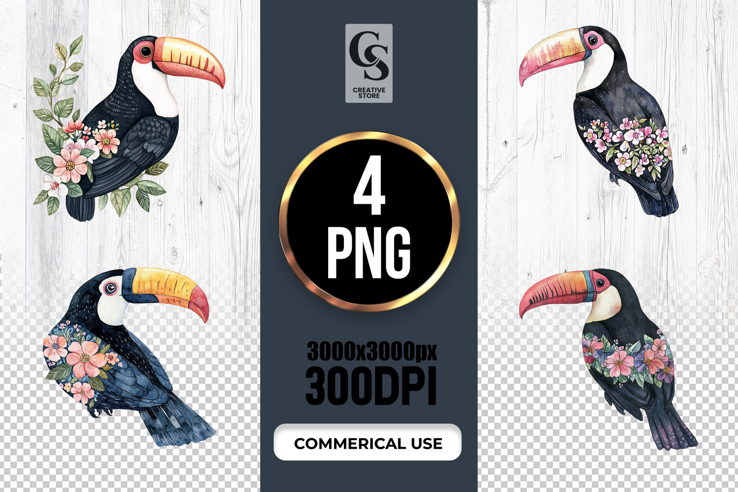 4 Floral Toucan Watercolor Clipart Sublimation PNG Files Perfect for Greeting Cards, Invitations, Junk Journal, Party Decor, Scrapbooking and many other craft projects.