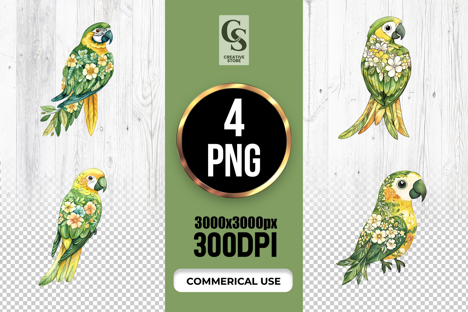 4 Floral Parrot Watercolor Illustration Clipart PNG Files Perfect for Greeting Cards, Invitations, Junk Journal, Party Decor, Scrapbooking and many other craft projects.