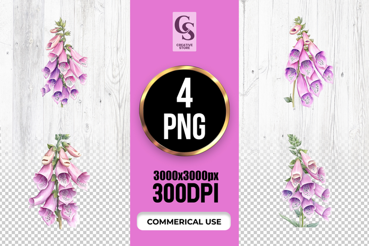 4 Foxglove Watercolor Floral Clipart Sublimation PNG Files Perfect for Greeting Cards, Invitations, Junk Journal, Party Decor, Scrapbooking and many other craft projects.