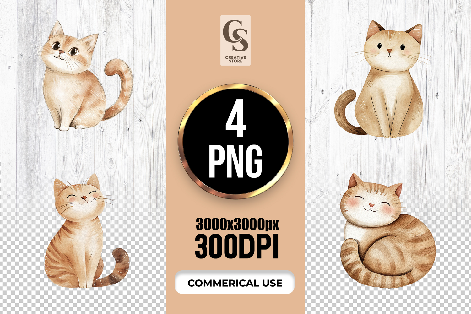 4 Cute Ginger Cat Watercolor Illustration Clipart Sublimation PNG Files Perfect for Greeting Cards, Invitations, Junk Journal, Party Decor, Scrapbooking and many other craft projects.