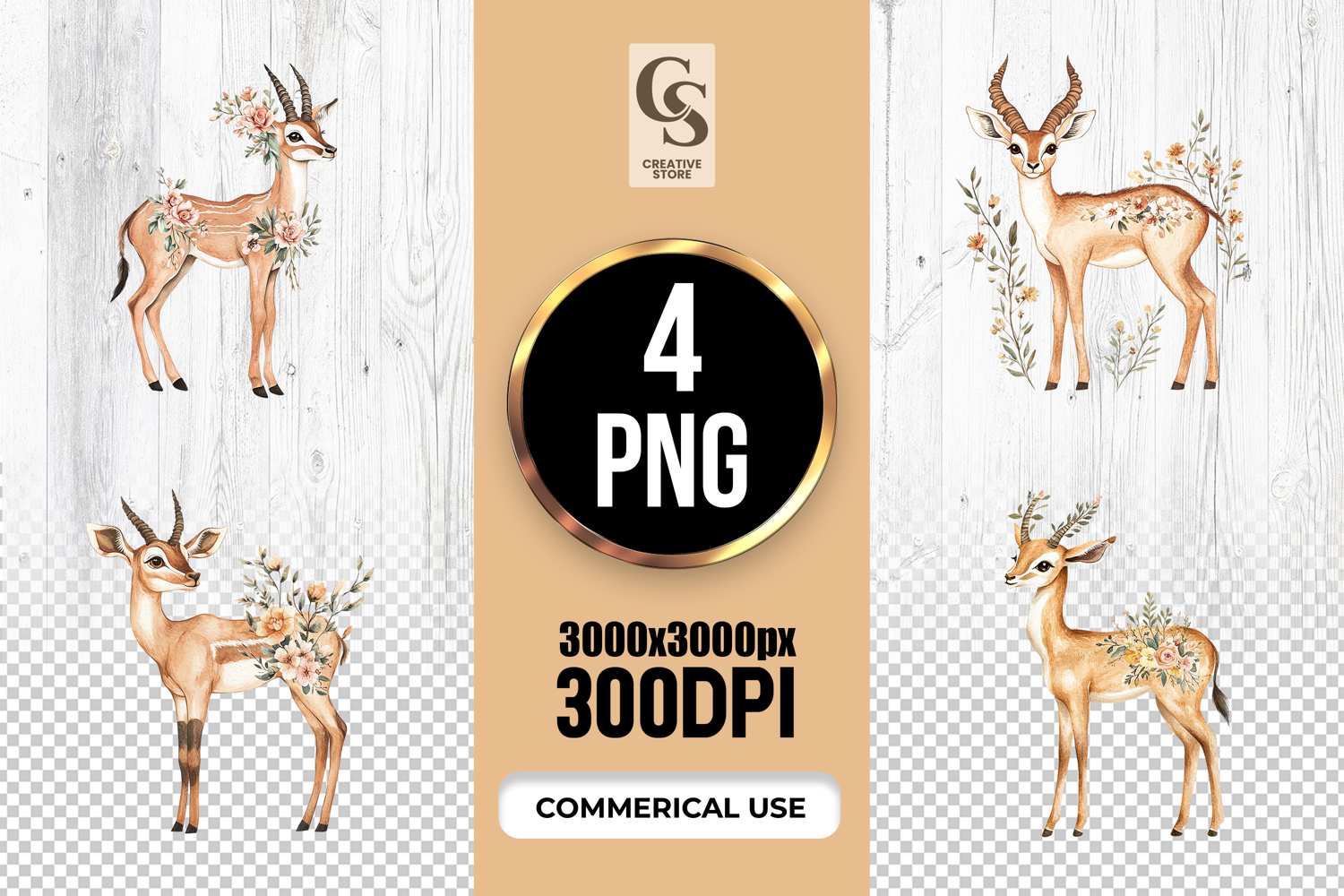 4 Watercolor Gazelle Clipart Sublimation PNG Files Perfect for Greeting Cards, Invitations, Junk Journal, Party Decor, Scrapbooking and many other craft projects.
