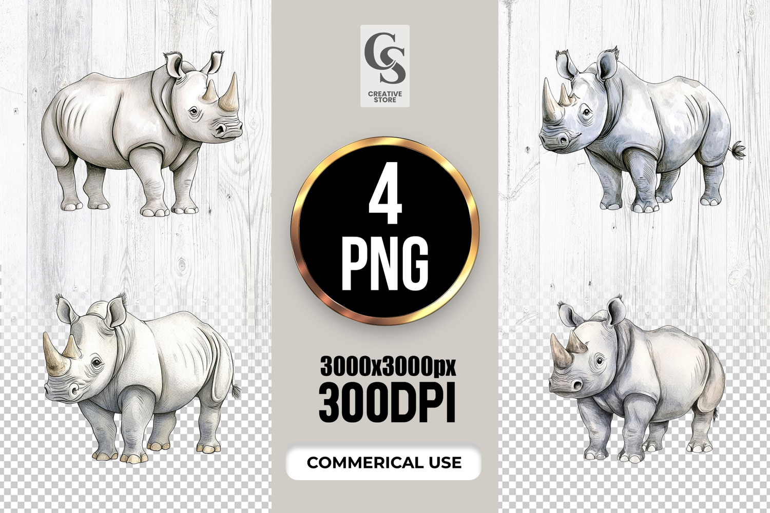 4 Watercolor Rhino Clipart Sublimation PNG Files Perfect for Greeting Cards, Invitations, Junk Journal, Party Decor, Scrapbooking and many other craft projects.