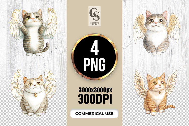 4 Angel Cat Clipart Sublimation PNG Files Perfect for Greeting Cards, Invitations, Junk Journal, Party Decor, Scrapbooking and many other craft projects.
