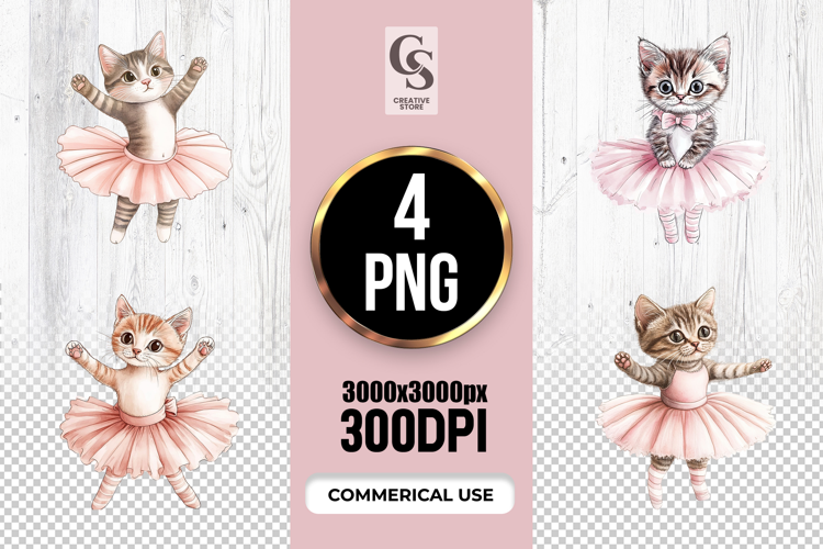 4 Ballerina Cat Clipart Sublimation PNG Files Perfect for Greeting Cards, Invitations, Junk Journal, Party Decor, Scrapbooking and many other craft projects.