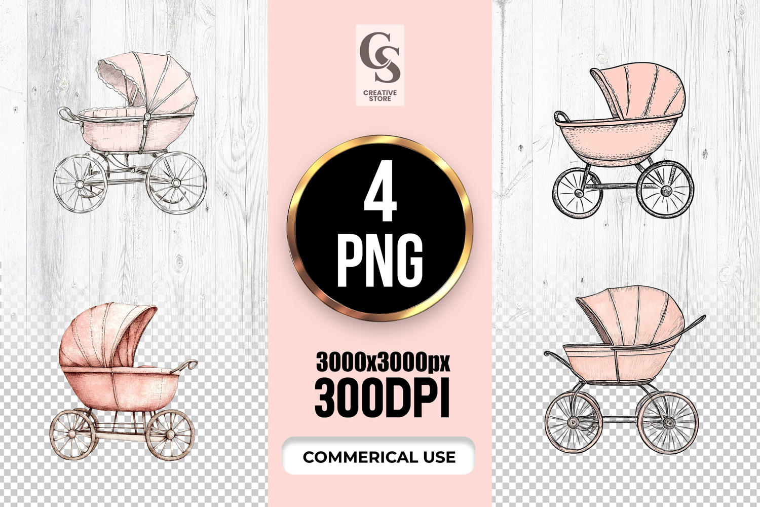 4 Vintage Pink Baby Carriage Clipart Sublimation PNG Files Perfect for Greeting Cards, Invitations, Junk Journal, Party Decor, Scrapbooking and many other craft projects.