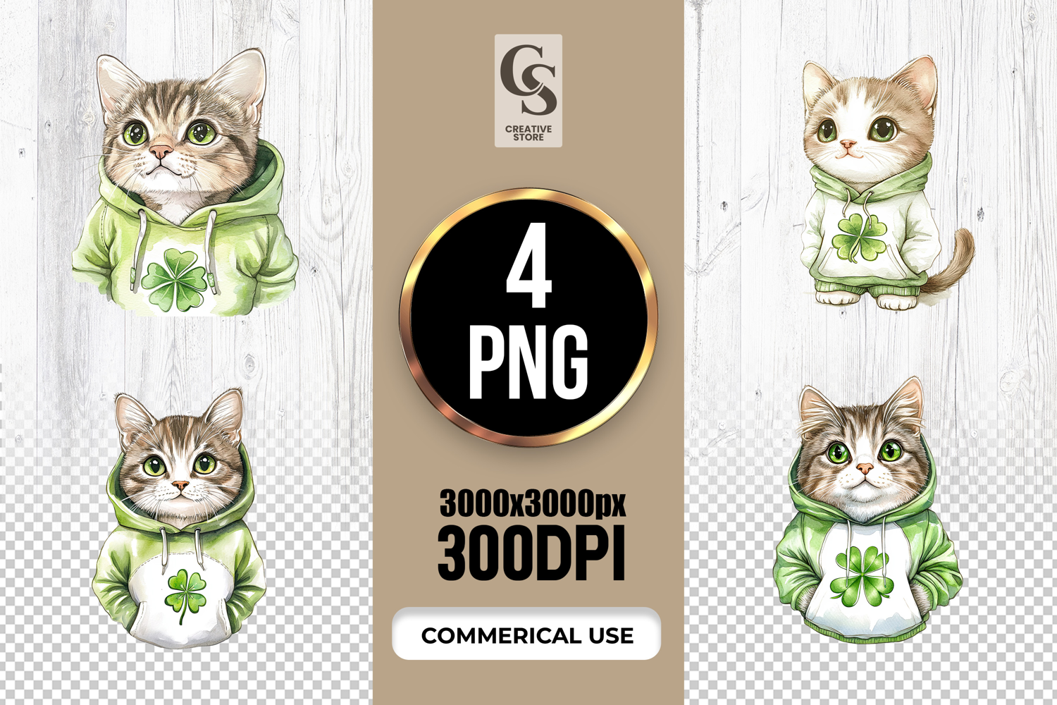 4 Cute Shamrock Hoodie Cat Clipart Sublimation PNG Files Perfect for Greeting Cards, Invitations, Junk Journal, Party Decor, Scrapbooking and many other craft projects.