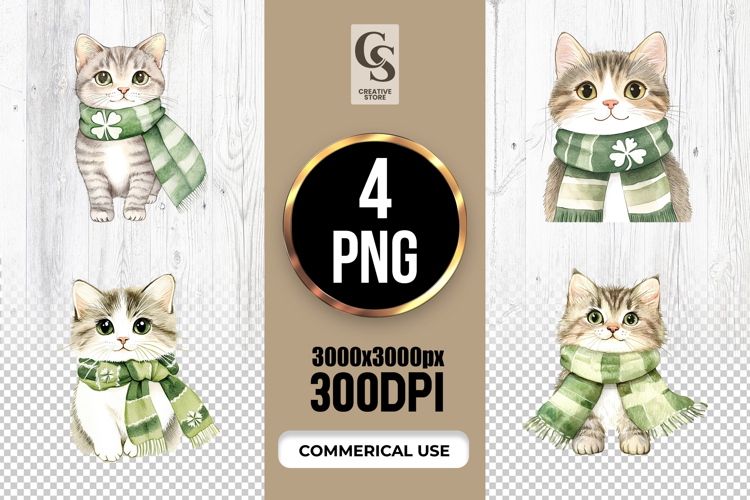 4 Cute Shamrock Scarf Cat Clipart Sublimation PNG Files Perfect for Greeting Cards, Invitations, Junk Journal, Party Decor, Scrapbooking and many other craft projects.