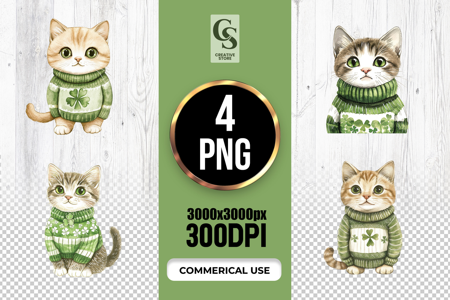 4 Cute Shamrock Sweater Cat Clipart Sublimation PNG Files Perfect for Greeting Cards, Invitations, Junk Journal, Party Decor, Scrapbooking and many other craft projects.