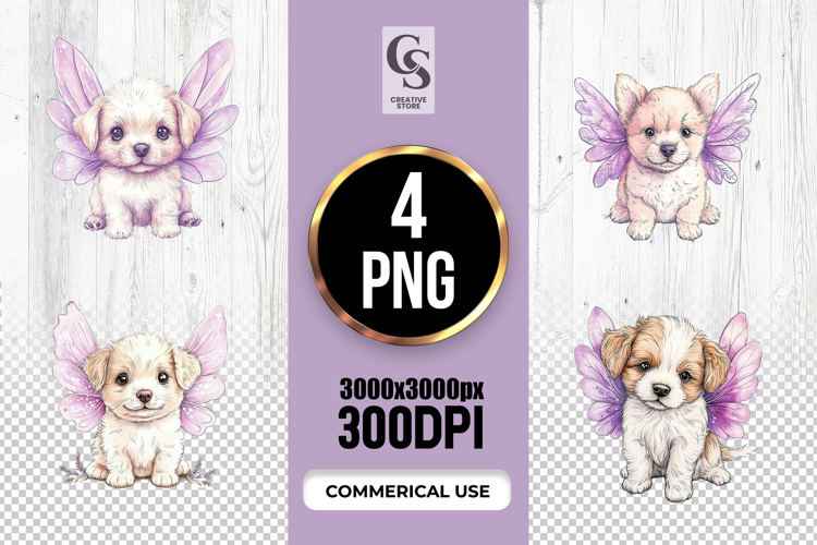 4 Cute Fairy Wing Puppy Dog Clipart Sublimation PNG Files Perfect for Greeting Cards, Invitations, Junk Journal, Party Decor, Scrapbooking and many other craft projects.