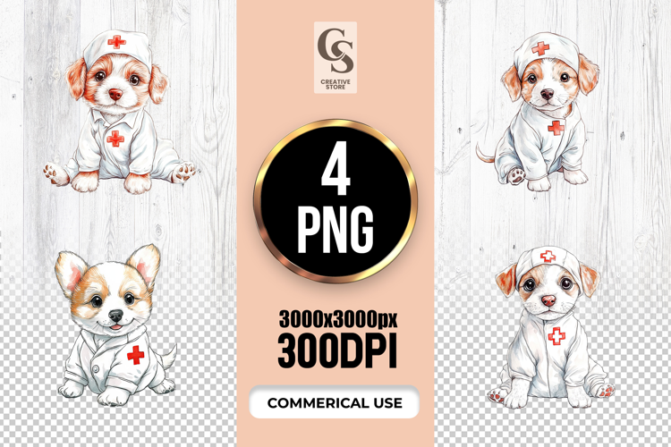 4 Cute Nurse Puppy Dog Clipart Sublimation PNG Files Perfect for Greeting Cards, Invitations, Junk Journal, Party Decor, Scrapbooking and many other craft projects.