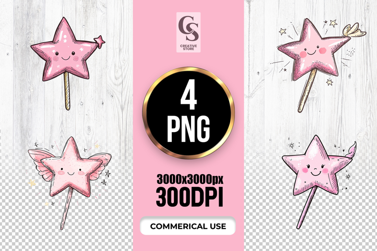 4 Cute Magic Star Wand Clipart Sublimation PNG Files Perfect for Greeting Cards, Invitations, Junk Journal, Party Decor, Scrapbooking and many other craft projects.