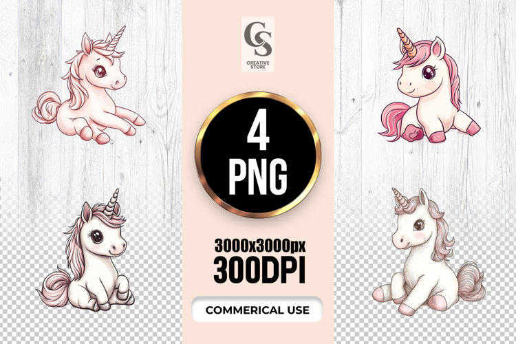 4 Cute Baby Unicorn Clipart Sublimation PNG Files Perfect for Greeting Cards, Invitations, Junk Journal, Party Decor, Scrapbooking and many other craft projects.