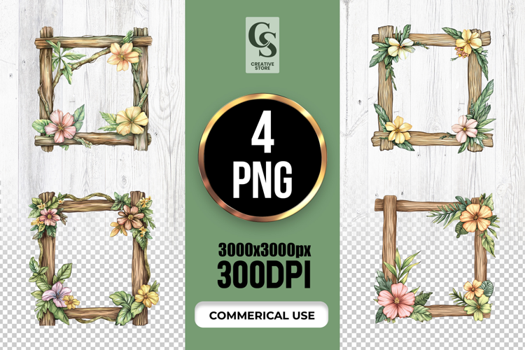4 Floral Wooden Frame Watercolor Clipart Sublimation PNG Files Perfect for Greeting Cards, Invitations, Junk Journal, Party Decor, Scrapbooking and many other craft projects.