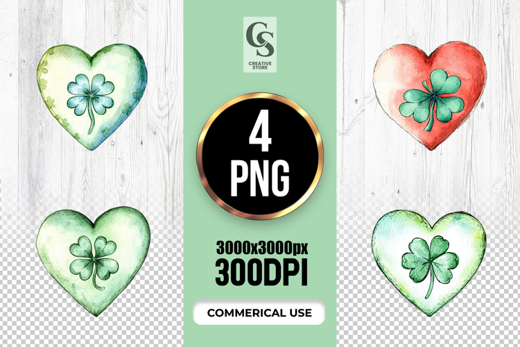 4 Watercolor Heart Clover Clipart Sublimation PNG Files Perfect for Greeting Cards, Invitations, Junk Journal, Party Decor, Scrapbooking and many other craft projects.