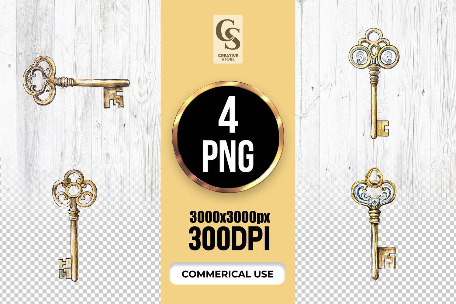 4 Watercolor Antique Skeleton Key Clipart Sublimation PNG Files Perfect for Greeting Cards, Invitations, Junk Journal, Party Decor, Scrapbooking and many other craft projects.