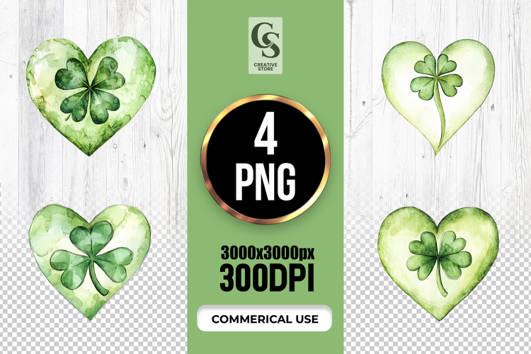 4 Watercolor Clover Heart Clipart Sublimation PNG Files Perfect for Greeting Cards, Invitations, Junk Journal, Party Decor, Scrapbooking and many other craft projects.
