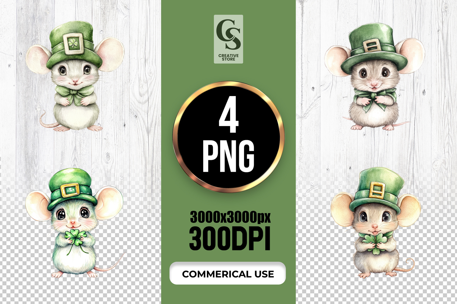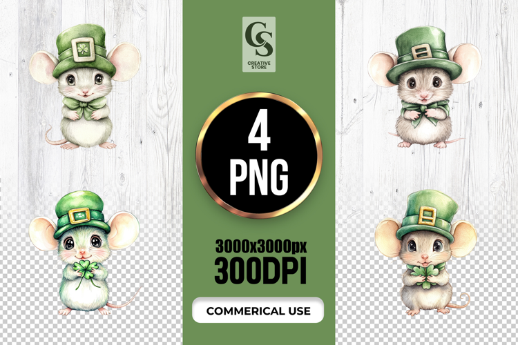 4 Cute Mouse Shamrock Clipart Sublimation PNG Files Perfect for Greeting Cards, Invitations, Junk Journal, Party Decor, Scrapbooking and many other craft projects.