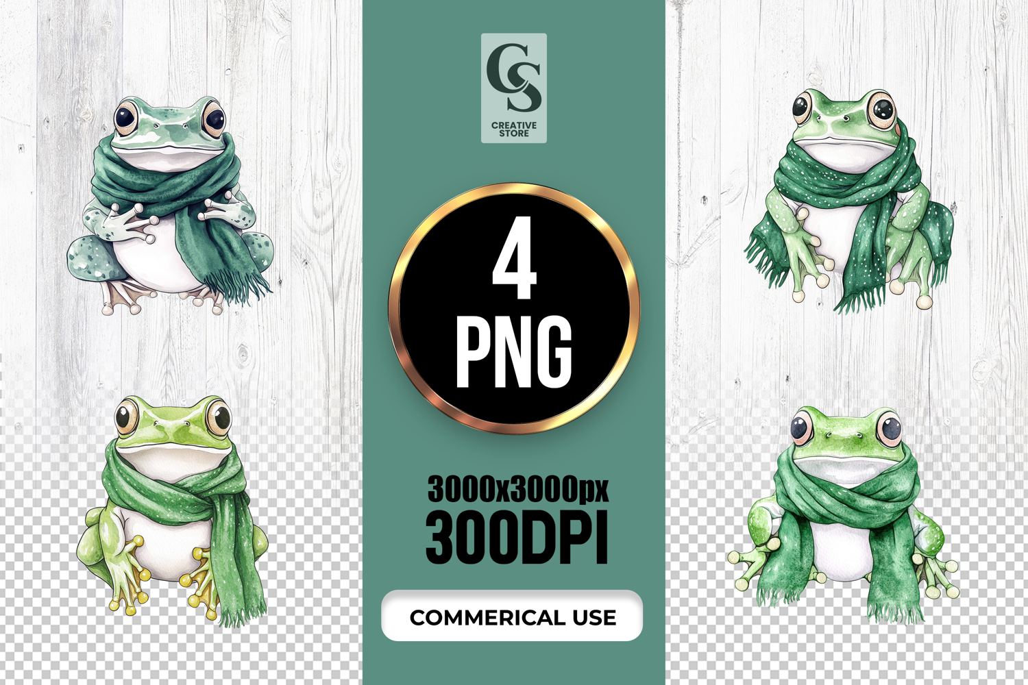 4 Cute Frog Green Scarf Clipart Sublimation PNG Files Perfect for Greeting Cards, Invitations, Junk Journal, Party Decor, Scrapbooking and many other craft projects.