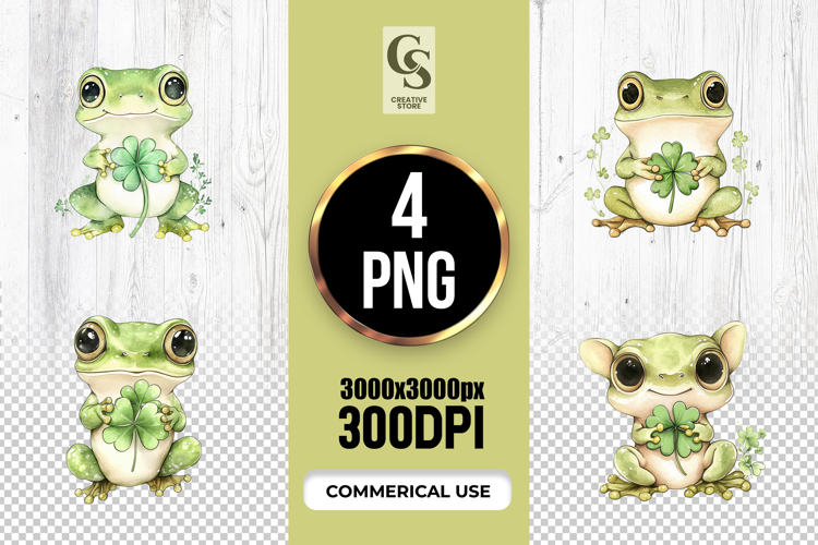 4 Cute Frog Lucky Clover Clipart Sublimation PNG Files Perfect for Greeting Cards, Invitations, Junk Journal, Party Decor, Scrapbooking and many other craft projects.