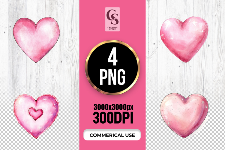 4 Cute Pink Glitter Watercolor Hearts Clipart Sublimation PNG Files Perfect for Greeting Cards, Invitations, Junk Journal, Party Decor, Scrapbooking and many other craft projects.