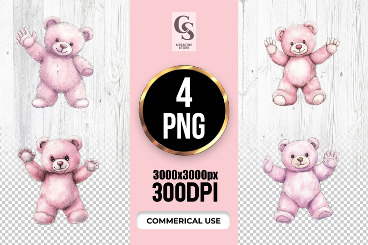 4 Cute Pink Teddy Bear Waving Clipart Sublimation PNGG Bundle Files Perfect for Greeting Cards, Invitations, Junk Journal, Party Decor, Scrapbooking and many other craft projects.