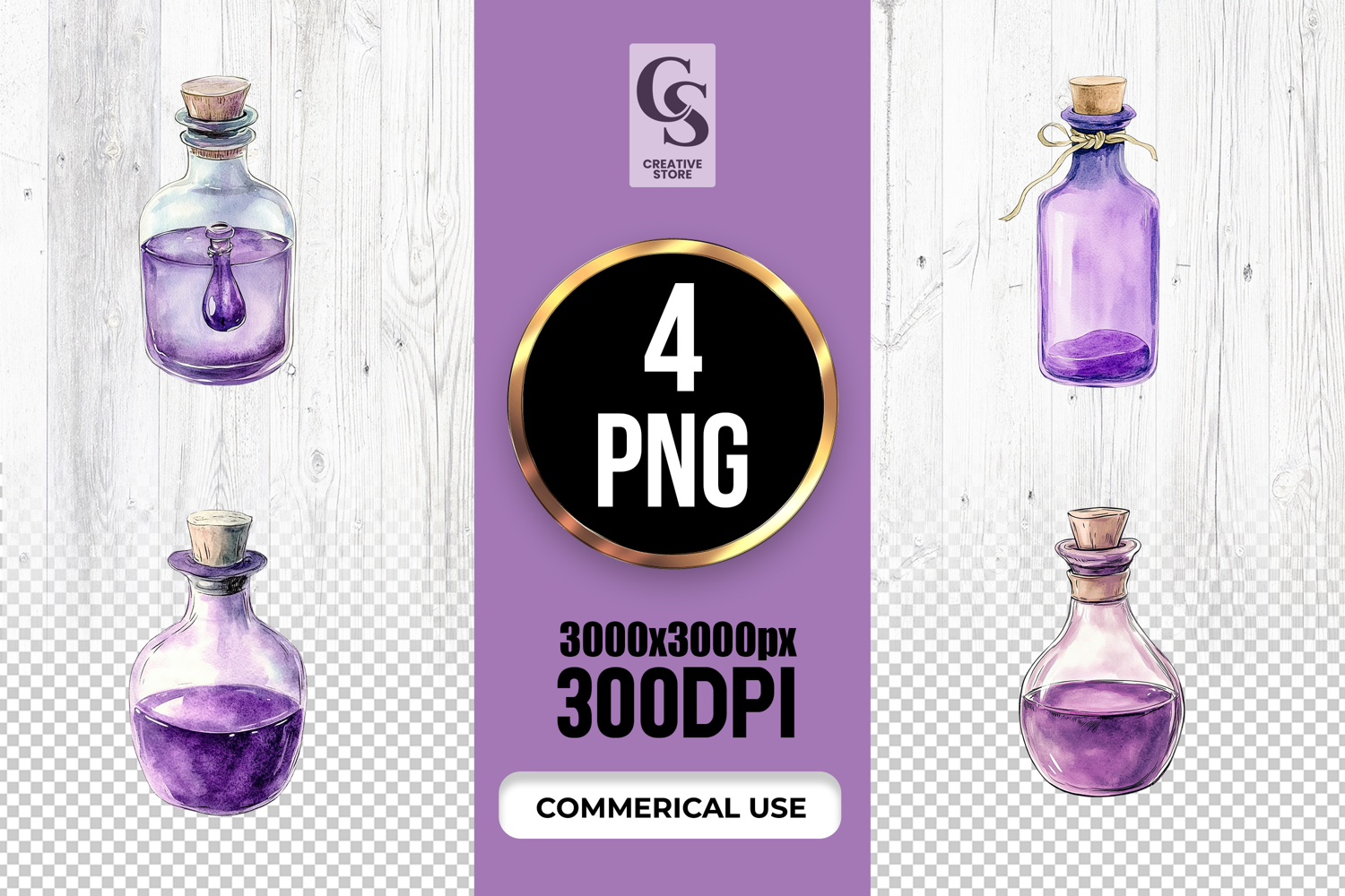 4 Watercolor Purple Magic Potion Bottles Clipart PNG Files Perfect for Greeting Cards, Invitations, Junk Journal, Party Decor, Scrapbooking and many other craft projects.