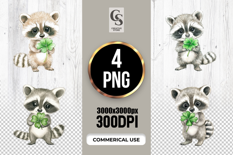 4 Cute Raccoon Four Leaf Clover Clipart Sublimation PNG Files Perfect for Greeting Cards, Invitations, Junk Journal, Party Decor, Scrapbooking and many other craft projects.