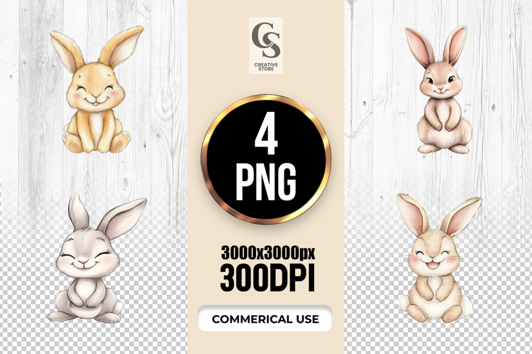 4 Cute Bunny Rabbit Watercolor Clipart Sublimation PNG Files Perfect for Greeting Cards, Invitations, Junk Journal, Party Decor, Scrapbooking and many other craft projects.