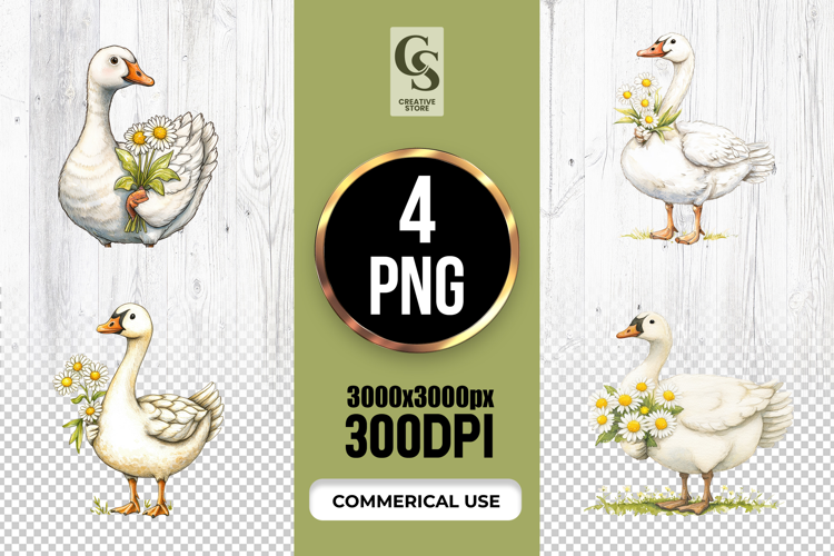 4 Watercolor Goose and Daisies Clipart Sublimation PNG Files Perfect for Greeting Cards, Invitations, Junk Journal, Party Decor, Scrapbooking and many other craft projects.