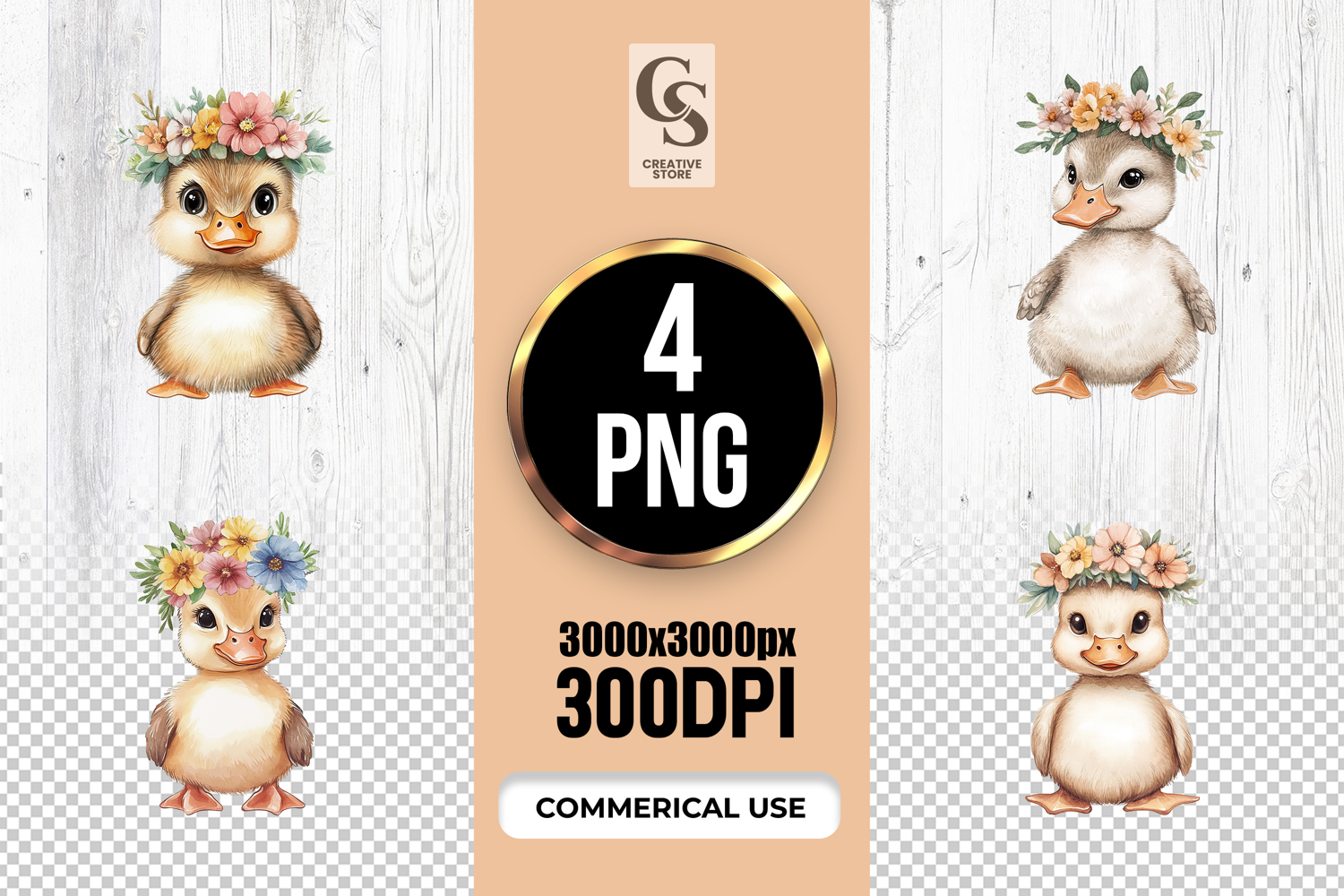 4 Watercolor Duckling Flower Crown Clipart Sublimation PNG Files Perfect for Greeting Cards, Invitations, Junk Journal, Party Decor, Scrapbooking and many other craft projects.