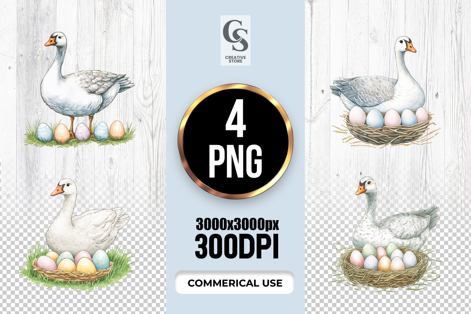4 Watercolor Goose with Pastel Eggs Clipart Sublimation PNG Files Perfect for Greeting Cards, Invitations, Junk Journal, Party Decor, Scrapbooking and many other craft projects.