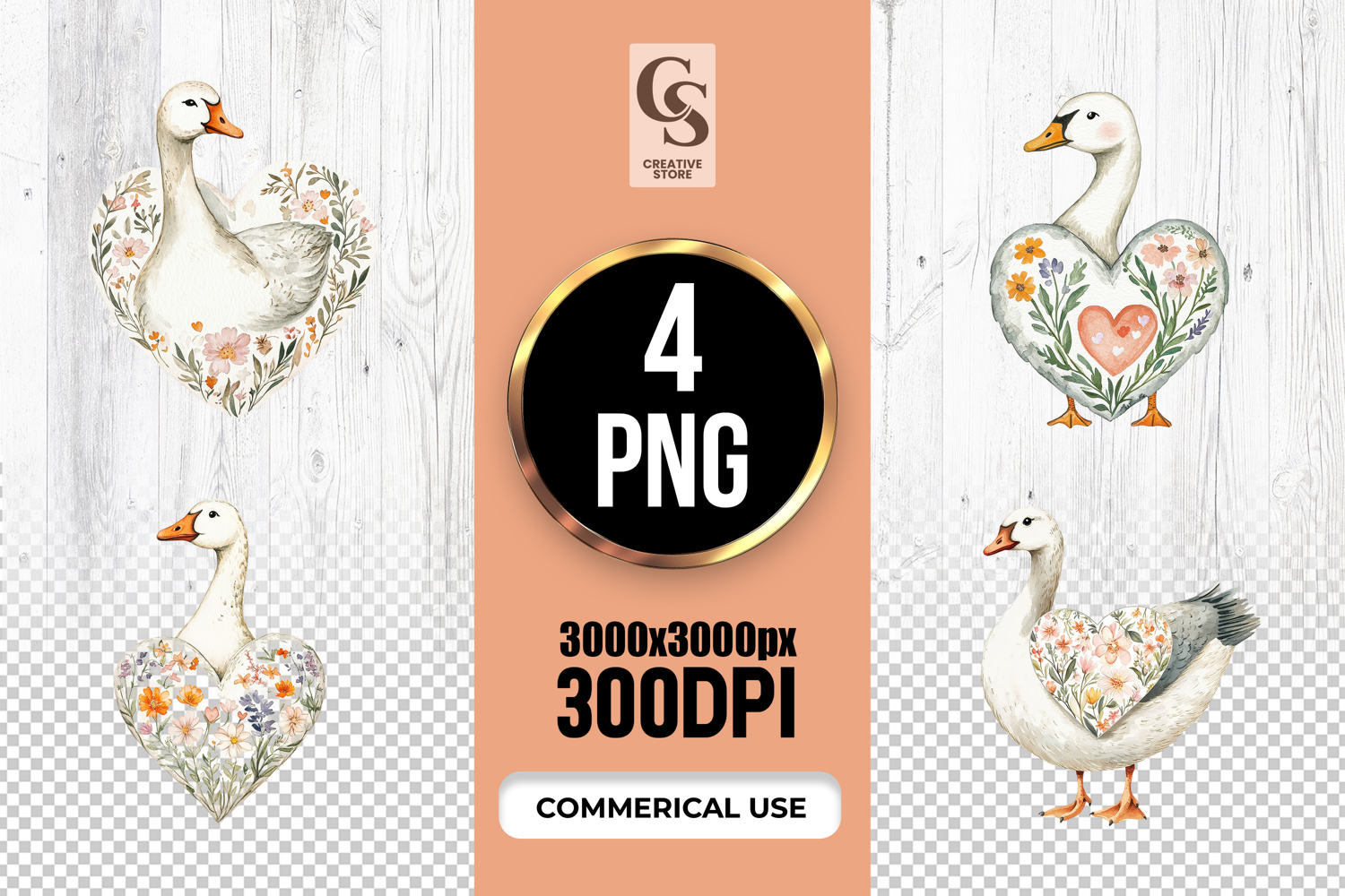 4 Watercolor Floral Goose Heart Clipart Sublimation PNG Files Perfect for Greeting Cards, Invitations, Junk Journal, Party Decor, Scrapbooking and many other craft projects.