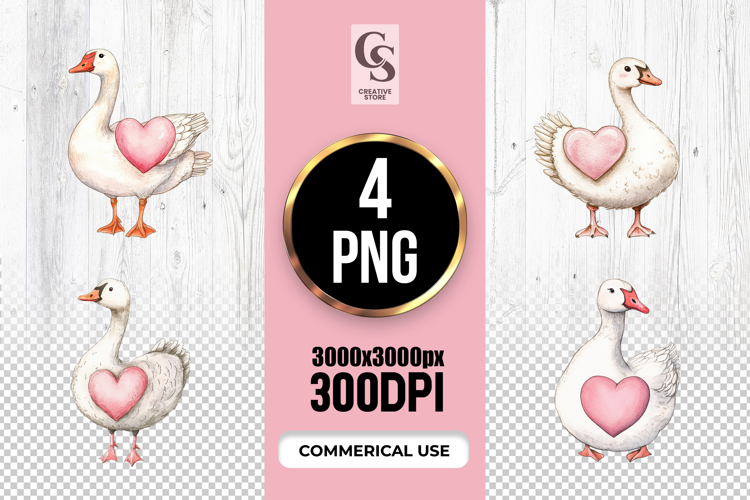 4 Watercolor Goose with Pink Heart Clipart Sublimation PNG Files Perfect for Greeting Cards, Invitations, Junk Journal, Party Decor, Scrapbooking and many other craft projects.